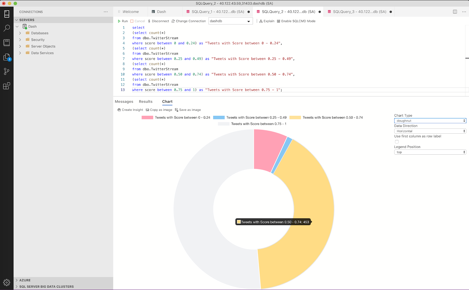 Once the tweets data along with sentiment analysis scores is stored in SQL Server Big Data Cluster, they’re ready for querying in Azure Data Studio.