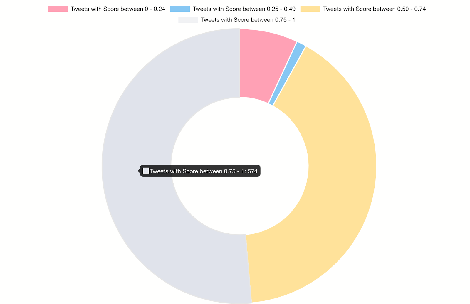 select (select count(*) from dbo.TwitterStream where score between 0 and 0.24) as "Tweets with Score between 0 - 0.24", (select count(*) from dbo.TwitterStream where score between 0.25 and 0.49) as "Tweets with Score between 0.25 - 0.49", (select count(*) from dbo.TwitterStream where score between 0.50 and 0.74) as "Tweets with Score between 0.50 - 0.74", (select count(*) from dbo.TwitterStream where score between 0.75 and 1) as "Tweets with Score between 0.75 - 1";