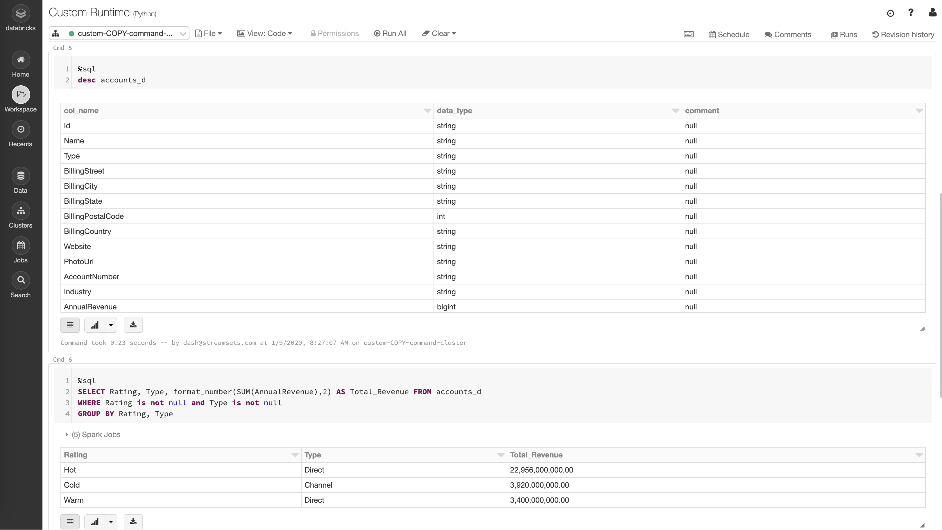 Once the Delta Lake table is populated, you can start analyzing the data. For example, running the following query will give us insights into total revenue generated based on account ratings and types of accounts.
